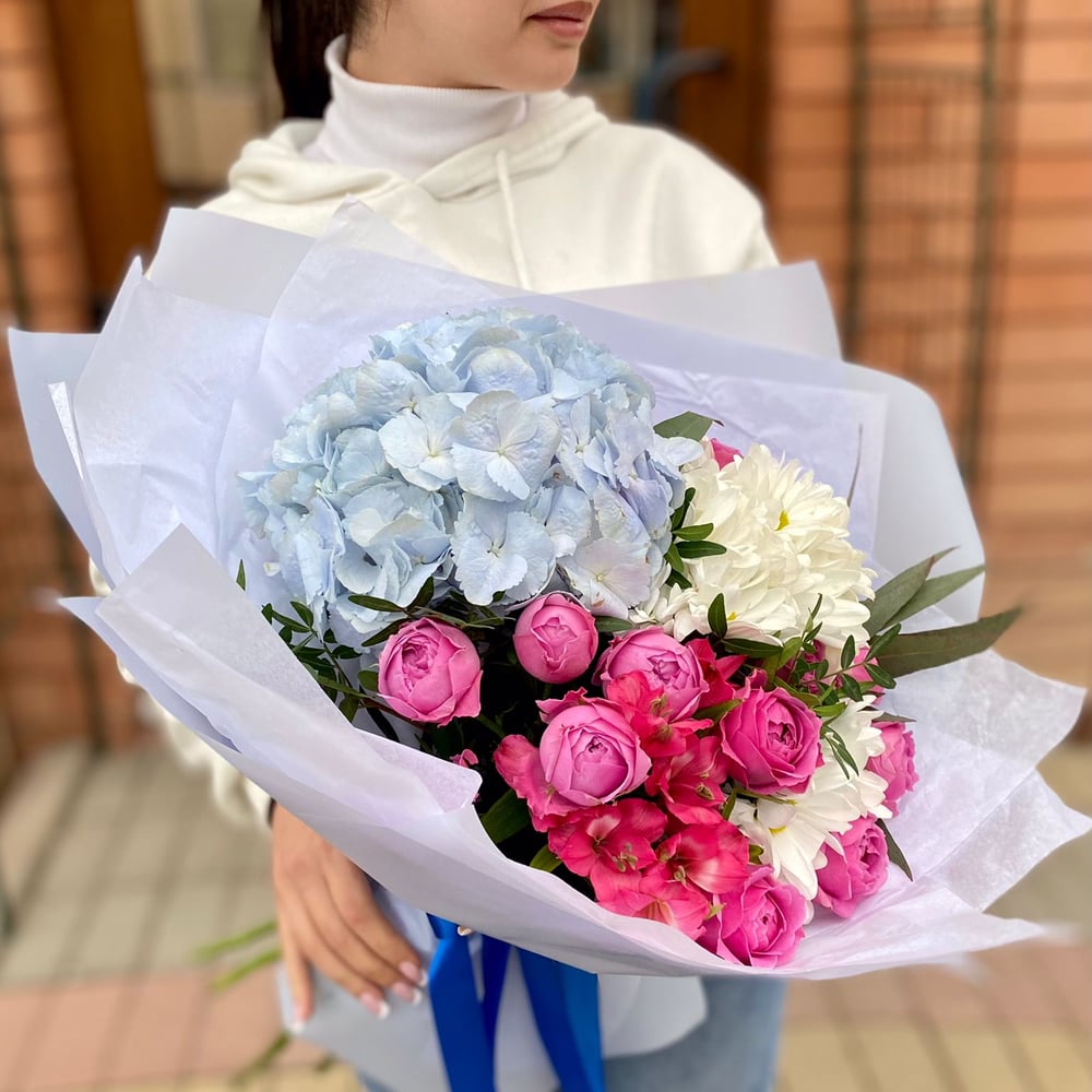 Букет «Голубой небосклон» из хризантем и гортензий