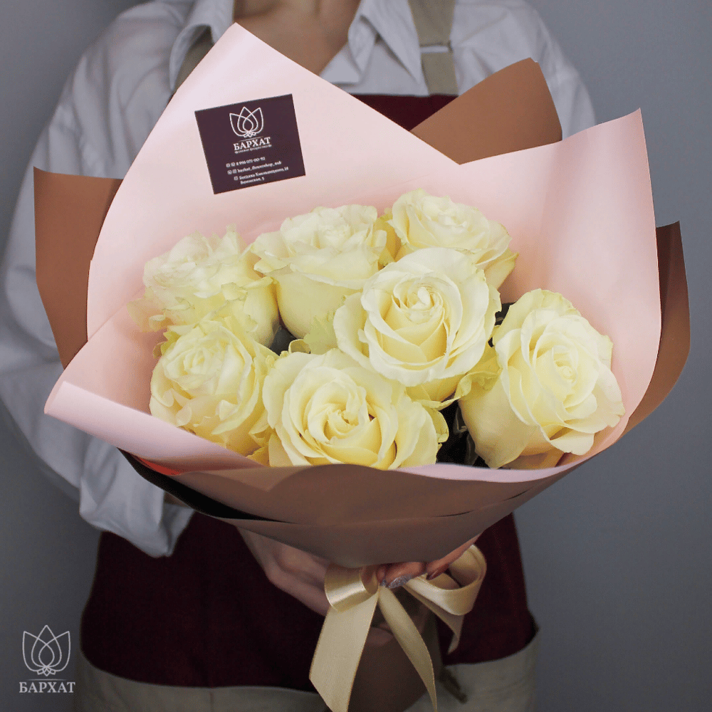 Монобукет из свежих цветов. Упаковка - флористическая пленка, лента, фирменная наклейка.