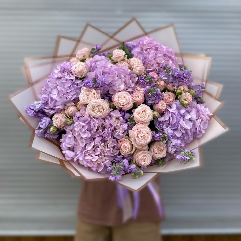 Букет из микса нежно розовых пионовидных роз , лавандовых гортензии и невероятно ароматной маттиолы . Букет подойдет к любому празднику: День Рождения, свадьба , на День Мамы, дочке , коллеге и пр...