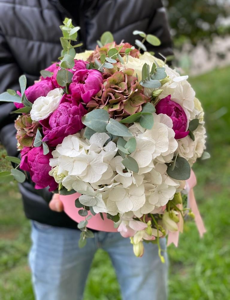 Шляпная коробка с цветами «Гортензия и пионы в коробке»