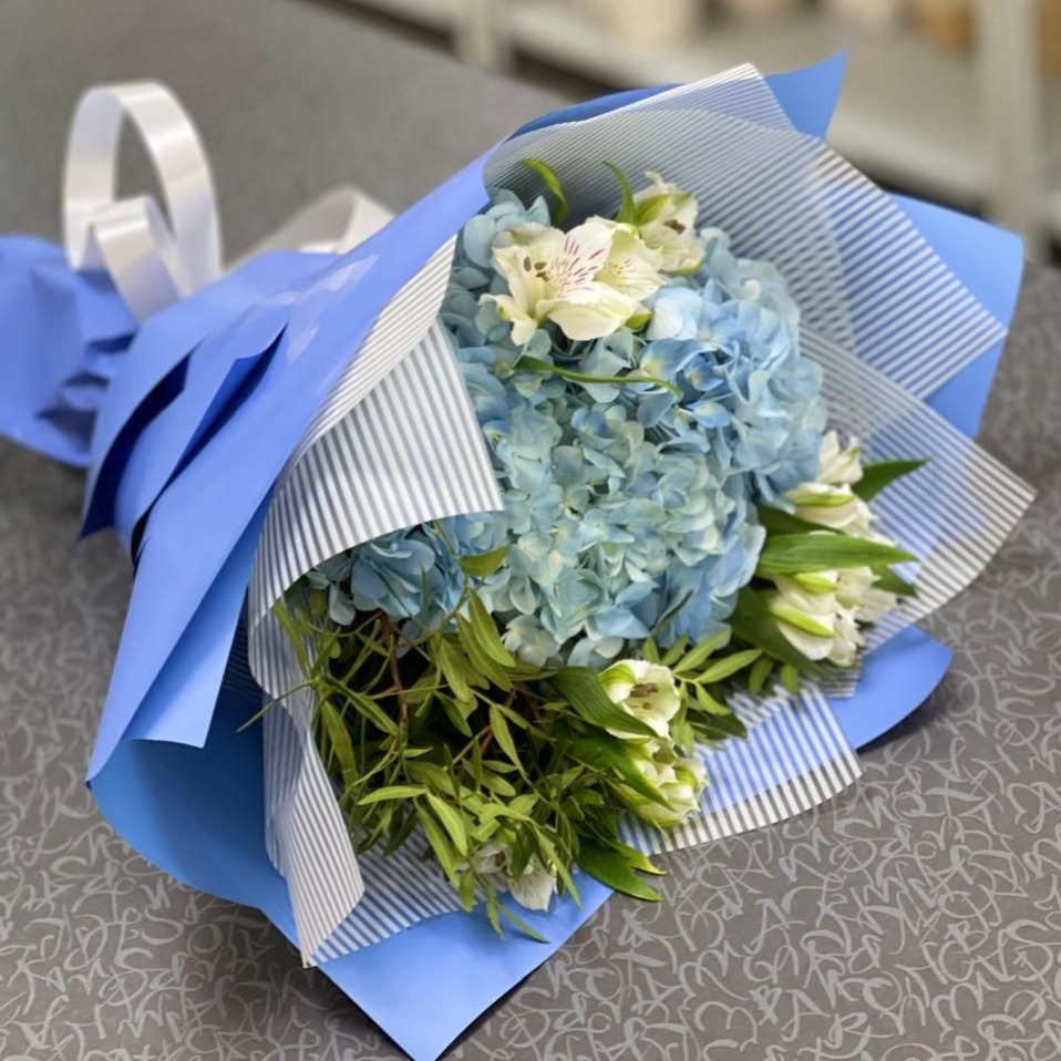 Нежный букет из воздушной гортензии и стойкой альстромерией в дизайнерской упаковке.