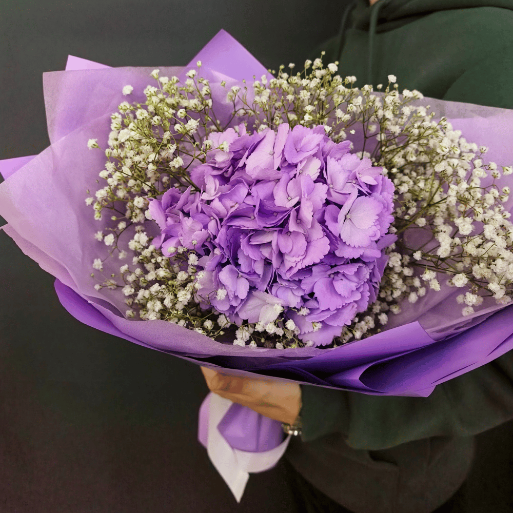 Букет-комплимент с прекрасной пышной гортензией и воздушной гипсофилой! Отличный знак внимания для любимой девушки, мамы или жены!