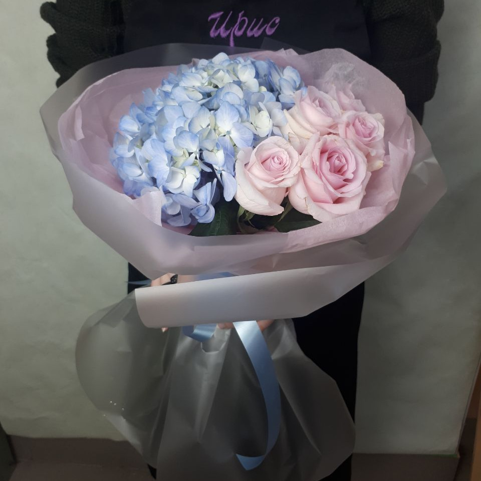 Букет в нежных тонах из гортензии и розы подарит хорошее настроение и вызовет улыбку!