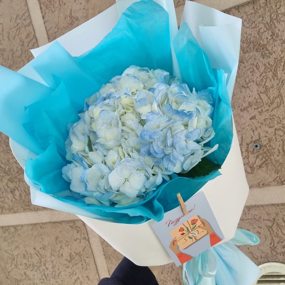 Голубая гортензия в фирменной упаковке