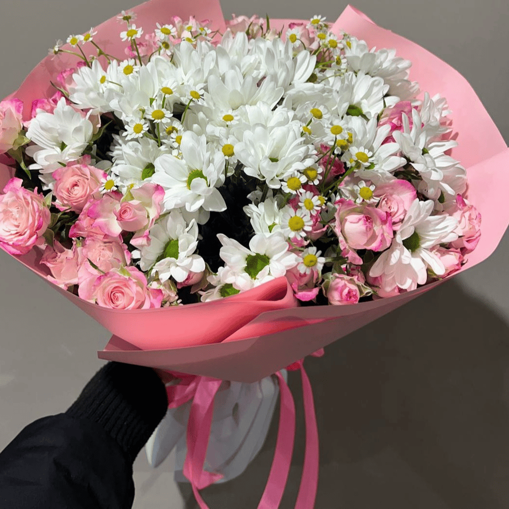 Кустовые розы с хризантемой С добавлением ромашек придадут настроение Для любимых