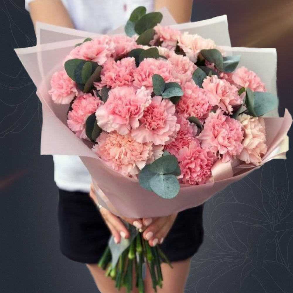 Классический сборный букет "грейта" из розовых гвоздик с эвкалиптом в матовой пленке с атласной лентой от 2name flowers - это стильный и изысканный подарок, который подойдет для любого повода. В сост…