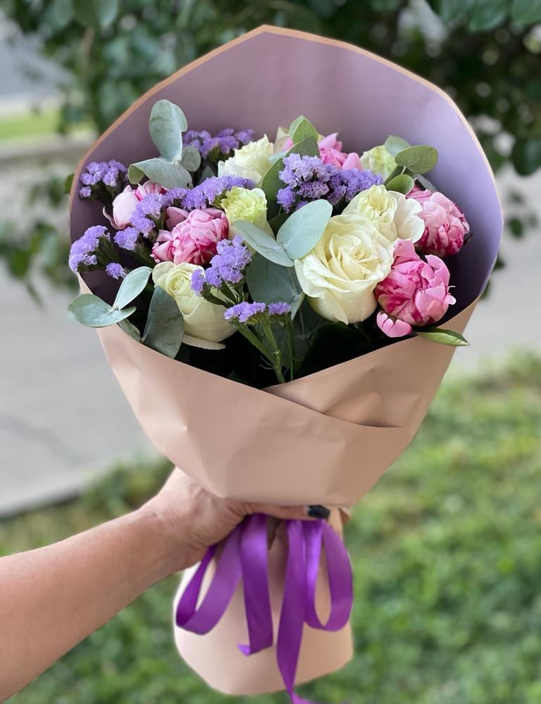 Букет «Грини» из роз и пионов