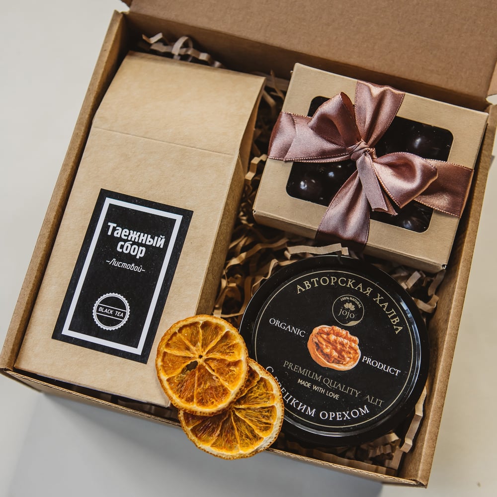 Что внутри? - чай черный "Таежный сбор" - халва с грецким орехом (200гр.) - ассорти орехов в темном шоколаде (150гр.) - открытка на выбор - оформление в крафтовой коробочке 20х20 см - украшена коробочка атласной лентой и бантом