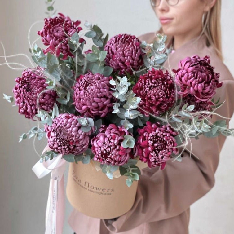 Винные хризантемы с эвкалиптом в крафтовой коробке