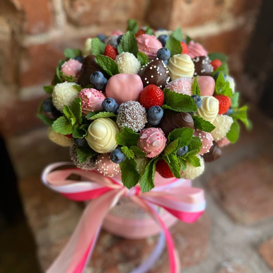 Съедобный фруктовый букет из клубники в шоколаде, голубики и мяты в шляпной коробке