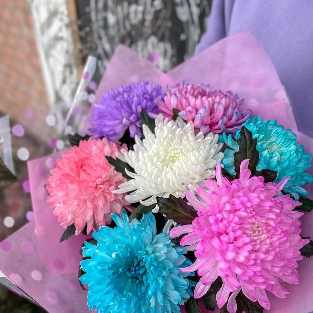 Букет из разноцветных огромных шапок хризантем, цвет может быть разный, в зависимости от наличия.