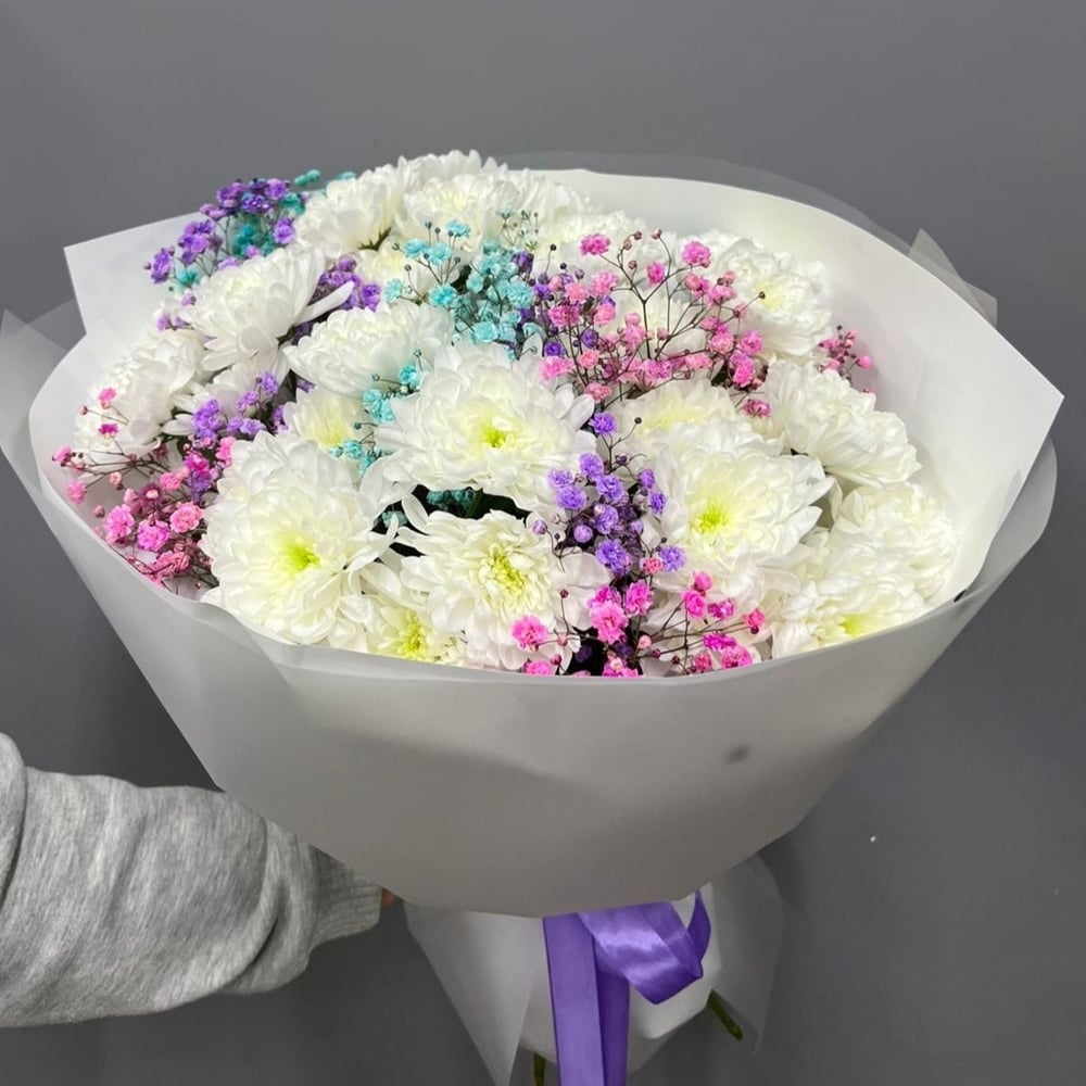 Букет «Хризантема Балтика и гипсофила»