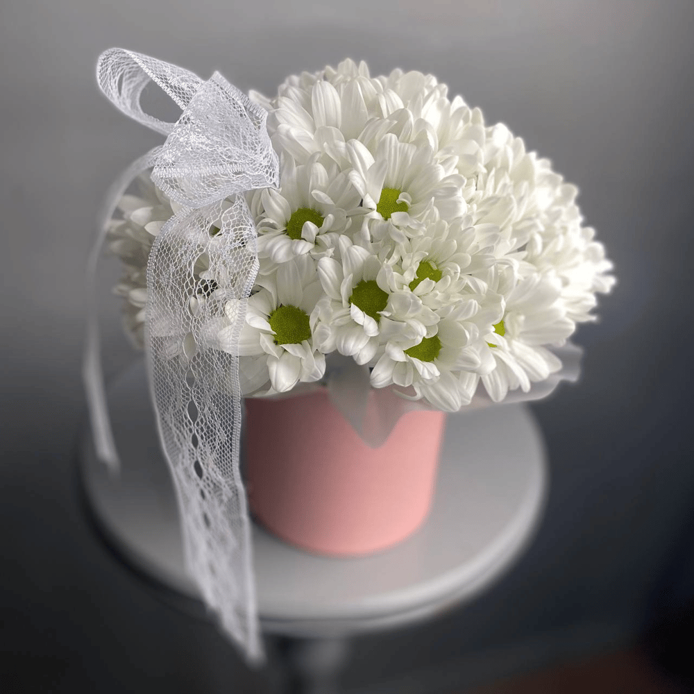 Шляпная коробка с цветами «Хризантема к коробочке»
