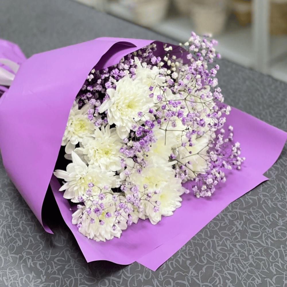 Букет из хризантемы и гипсофилы порадует любого получателя и подойдет по любому поводу!