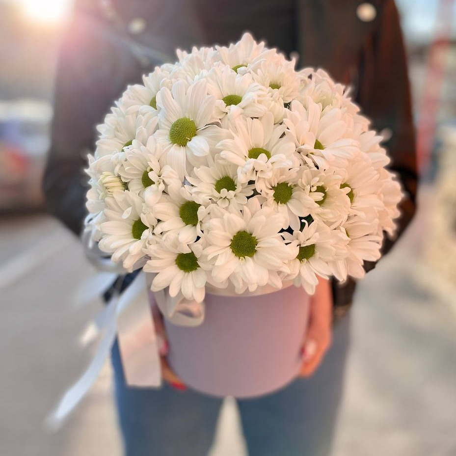 Кустовая ромашковая белая хризантема в шляпной коробке