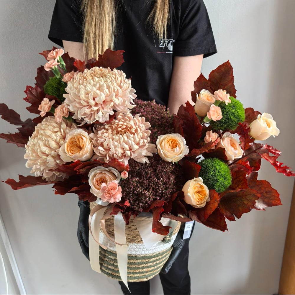 Осенняя композиция в корзине — это настоящее произведение искусства, которое передает всю красоту и тепло уходящего сезона. В центре внимания — одноголовые хризантемы сорта «Авиньен» нежного кремового оттенка, которые символизируют нежность и утонченность. Их окружают одноголовые розы «Джульетта» с изысканными лепестками, добавляющими композиции элегантности и романтики. Гвоздики сорта «Грин Трик» и кустовые гвоздики создают яркий акцент, а седум с его насыщенными бордовыми оттенками добавляет глубины и текстуры. Дубовые листья, окрашенные в теплые осенние тона, завершают образ, подчеркивая природную гармонию и уют. Вся композиция размещена в плетеной корзине, украшенной атласными лентами, что придает ей изысканность и завершенность. Этот букет станет прекрасным подарком или украшением интерьера, наполняя пространство теплом и уютом.