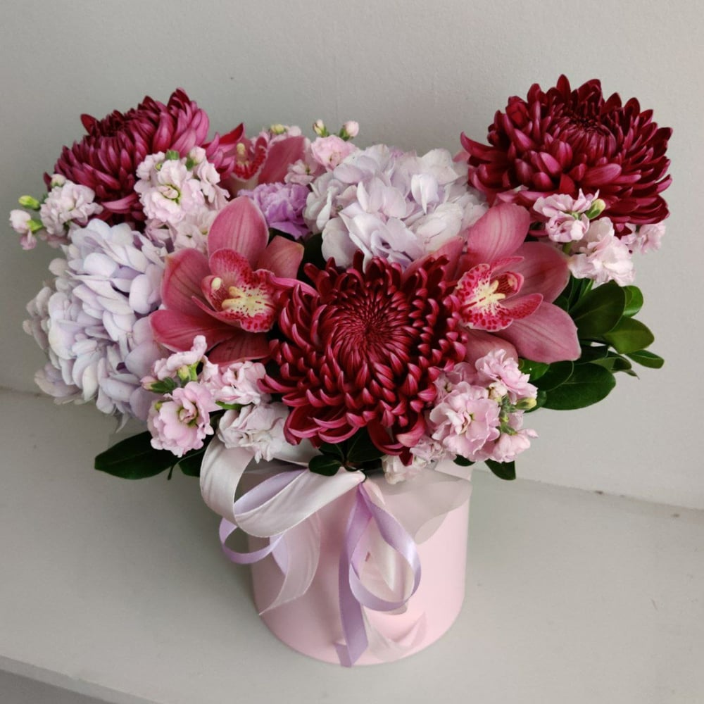 Шляпная коробка с цветами «Хризантемы бигуди, гортензия и орхидея»