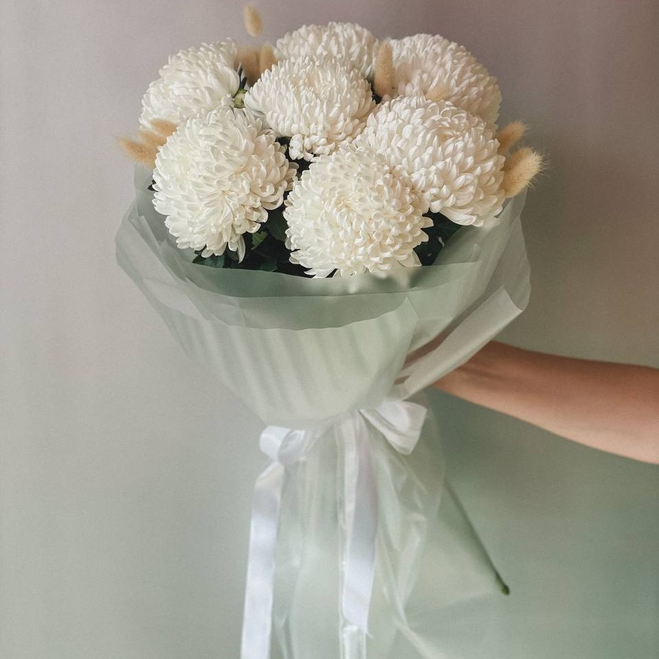 Белые сезонные хризантемы для мамы в дизайнерской упаковке.