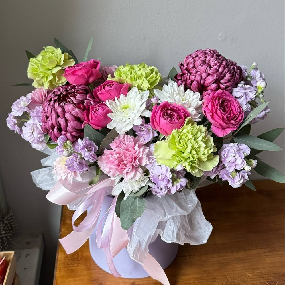 Эта композиция в шляпной коробке — настоящее произведение искусства, которое сочетает в себе нежность, яркость и изысканность. В центре внимания — кустовые пионовидные розы насыщенного розового цвета, которые создают основу букета, добавляя ему объем и романтичность. Хризантемы Бигуди Перпл с их необычной завитой формой лепестков и глубоким фиолетовым оттенком придают композиции изысканность и текстурность. Гвоздики светло-зеленого и нежно-розового оттенков добавляют свежести и легкости, создавая гармонию в цветовой палитре. Кустовая маттиола с ее мелкими сиреневыми цветами создает воздушный акцент, наполняя букет нежностью и легкостью. Кустовая хризантема белого цвета символизируют чистоту и искренность. Эвкалипт завершает композицию, придавая ей природную свежесть и объем. Его серебристо-зеленые листья словно обрамляют букет, создавая ощущение завершенности. Вся композиция аккуратно уложена в шляпную коробку, украшенную белой упаковочной бумагой и нежно-розовой атласной лентой. Эта композиция идеально подойдет для торжественных случаев, таких как день рождения, юбилей или романтический вечер. Она выражает нежность, заботу и внимание к деталям.