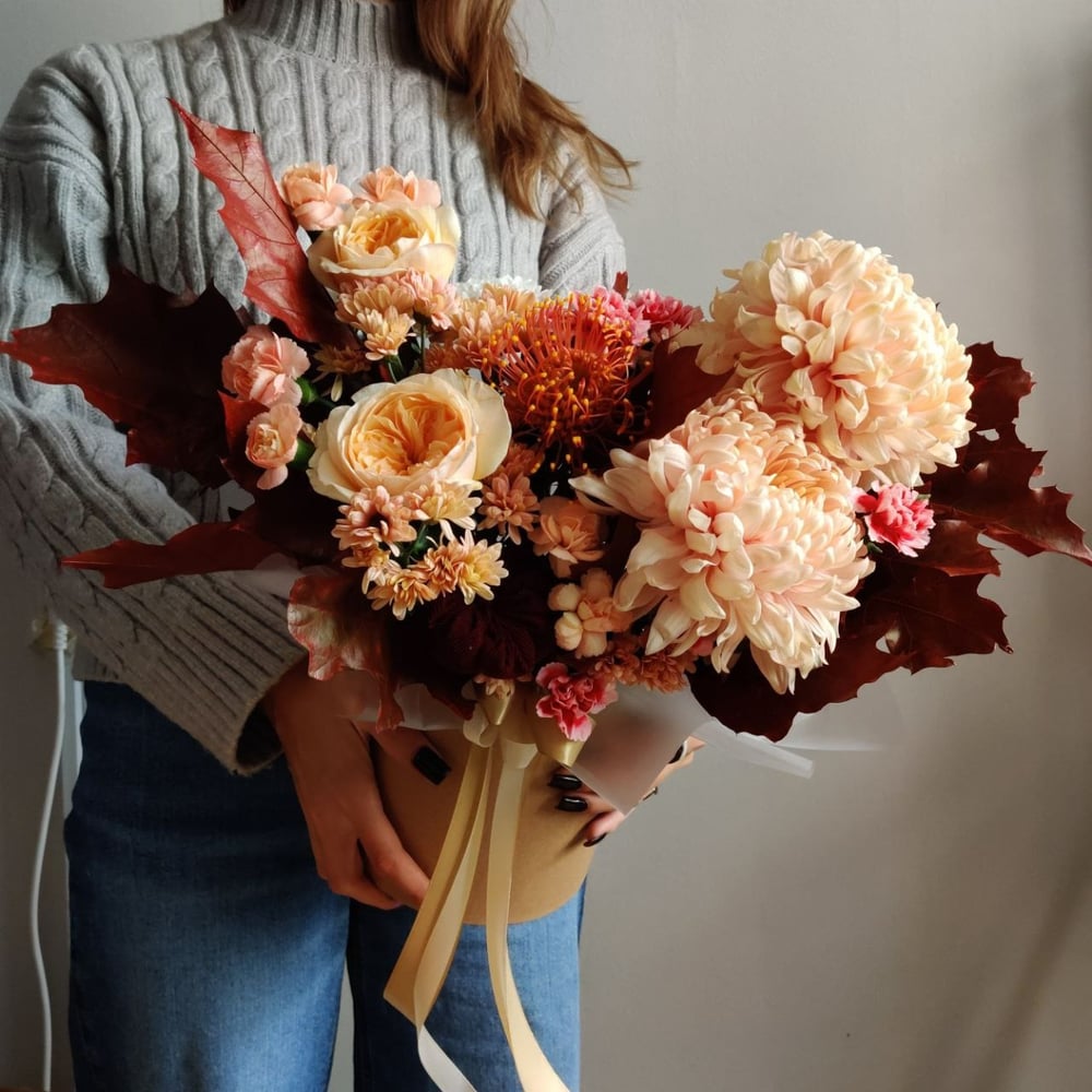 Композиция в шляпной коробке представляет собой изысканное сочетание цветов и текстур. Основу букета составляют крупные хризантемы сорта «Авиньон» нежного персикового оттенка, которые придают композиции объем и элегантность. Среди них расположены пионовидные розы «Джульетта» с их изысканными, многослойными лепестками, создающими ощущение утонченности и романтики. Яркие соцветия леукоспермума добавляют экзотичности и динамики, а кустовые хризантемы и гвоздики создают текстурное разнообразие. Листья дуба насыщенного бордового цвета добавляют контраст и природную естественность. Завершающим штрихом композиции стала текстильная тыква ручной работы, которая придает букету осенний уют и оригинальность. Вся композиция аккуратно оформлена в шляпной коробке, украшенной атласными лентами, что делает ее идеальным подарком для особого случая.