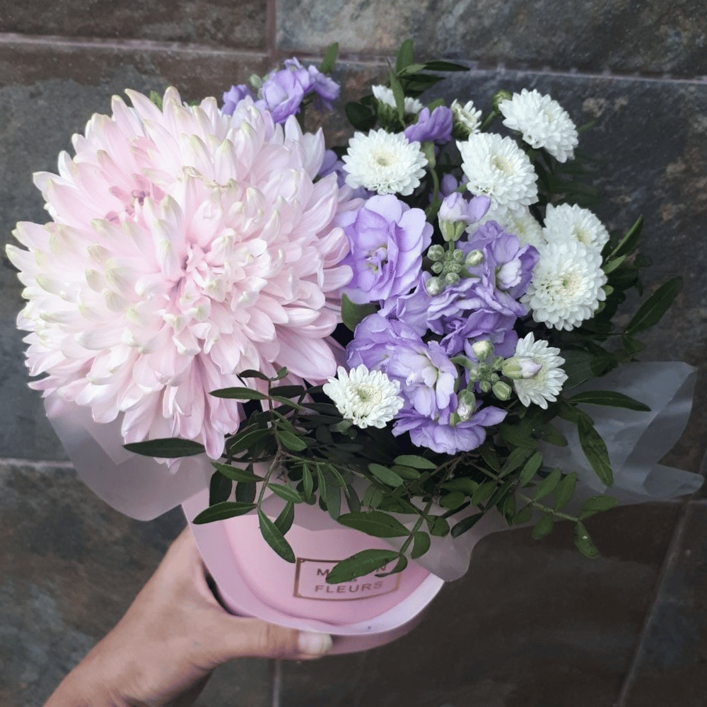 Шляпная коробка с цветами «Хризантемы с маттиолой в конусе»