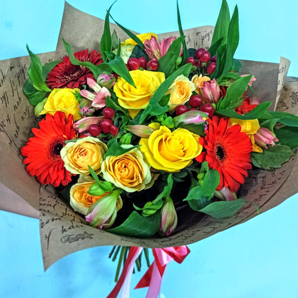 Яркий, солнечный и темпераментный букет из гербер, альстромерий и роз
