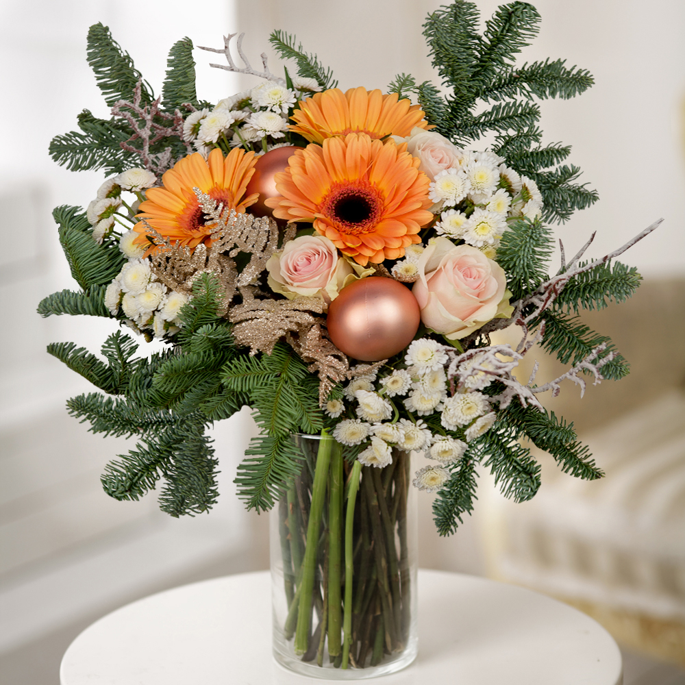 An absolutely stunning Christmas gift your friends and family will adore! The perfect combination of dazzling orange gerberas, white roses, lisianthuses and daisy poms are on display with fragrant fir tree branches and sparkling gold ornaments to make a visually striking gift for anyone you love.