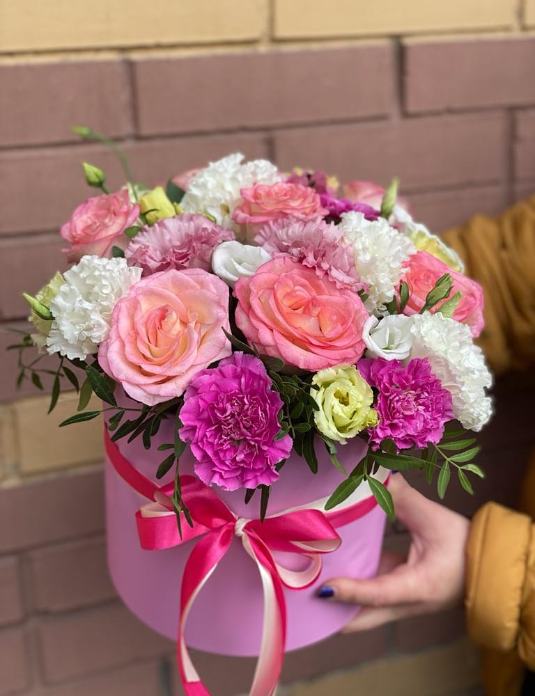 Шляпная коробка с цветами «Императрица» из роз и эустом