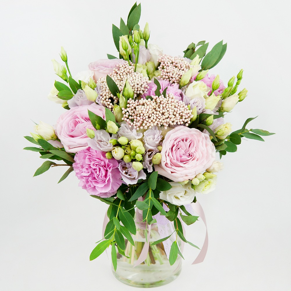 Delicate and fresh as youth itself, this magnificent bridal bouquet of peony roses, ozotamnus, carnations, lisianthus and roses will become the highlight of your wedding image.