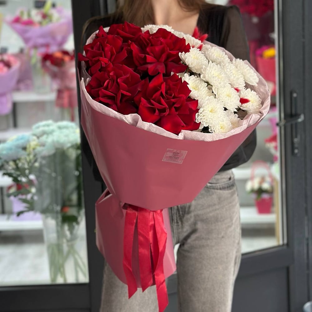 Букет «Инь и Янь» из роз и хризантем
