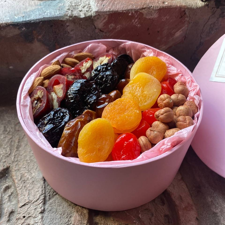 Съедобный букет из сухофруктов, орехов и цукатов в дизайнерской коробке