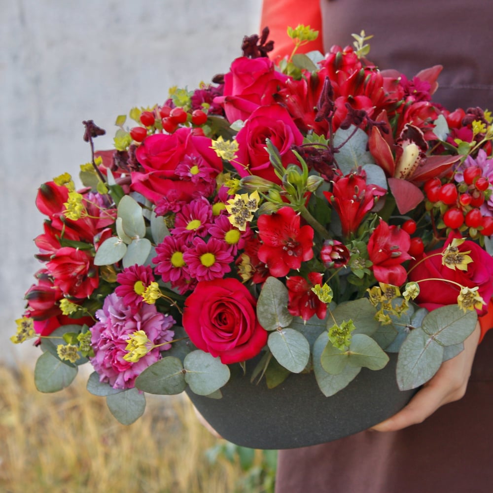 Шикарная интерьерная композиция в бордовые тонах. Кашпо из искусственного камня.