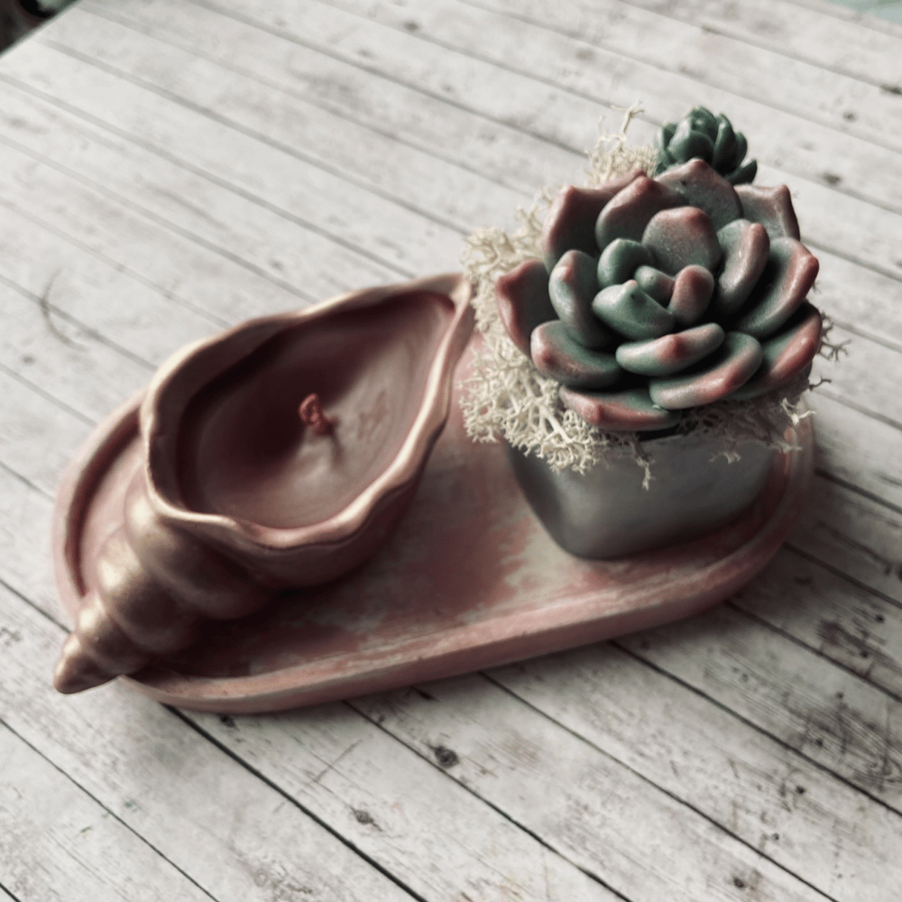 Стильная , ароматная интерьерная композиция для интерьера «Мечты о море» станет отличным подарком, как молодой девушке, так и более зрелой даме, прекрасно дополнит интерьер , став милым аксессуаром👌В составе набора: мини поднос 18х9 см 1шт, ракушка со свечой ( аромат лаванда, роза, сандал) 1 шт, и мини композиция из мыла с суккулентом эхеверией 1шт.