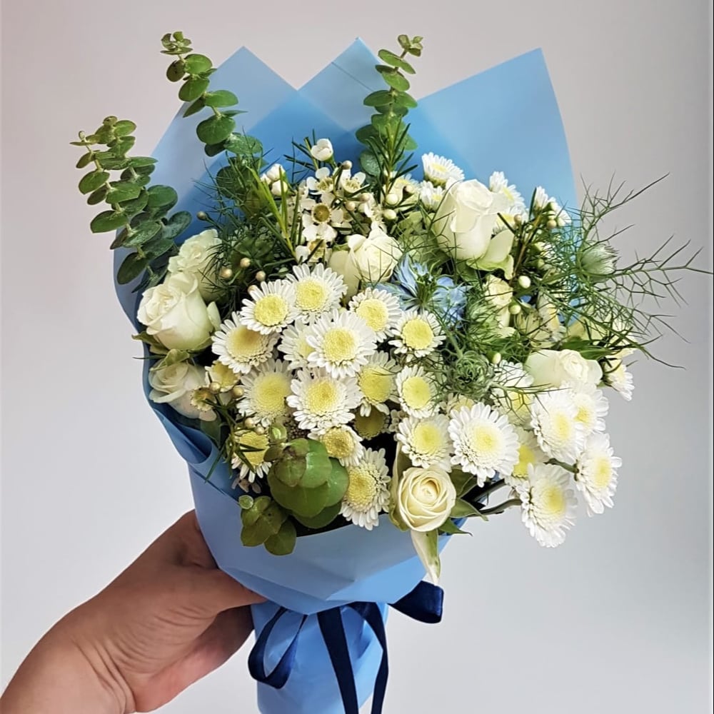 Интересный и оригинальный авторский сборный букет с розами, хризантемами и различной флористической зеленью. Кустовая хризантема привлекает взгляд своими яркими лепестками, а розы – символ любви и красоты, добавляют романтичности и изящества букету. Зелень отвечает за стильный вид, а упаковка и лента дополняют композицию, подчеркивая его утонченность и роскошь. Станет прекрасным подарком для любого случая.