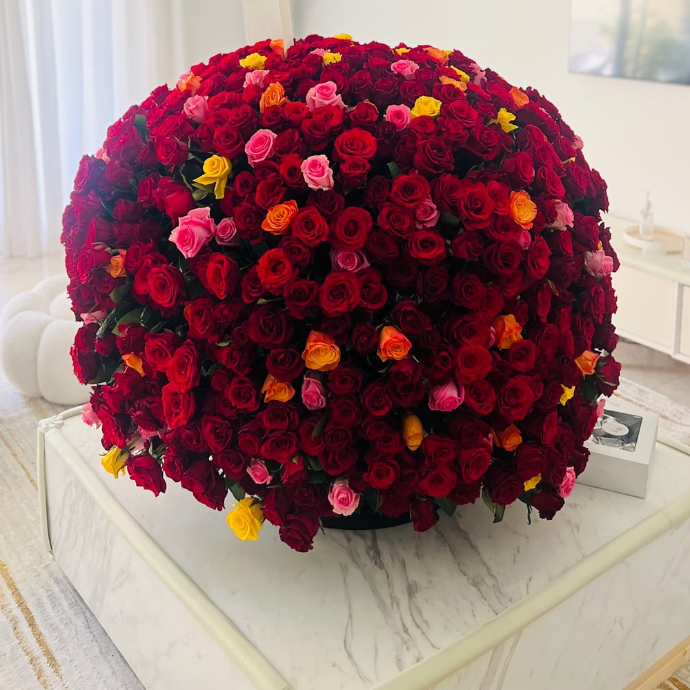 Композиция в коробке из 1001 роз: 851 красная роза, 50 розовых роз, 50 желтых роз и 50 оранжевых роз.