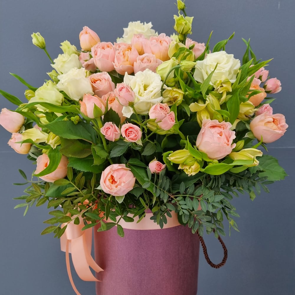 Шляпная коробка с цветами «Изумительный» из роз и эустом