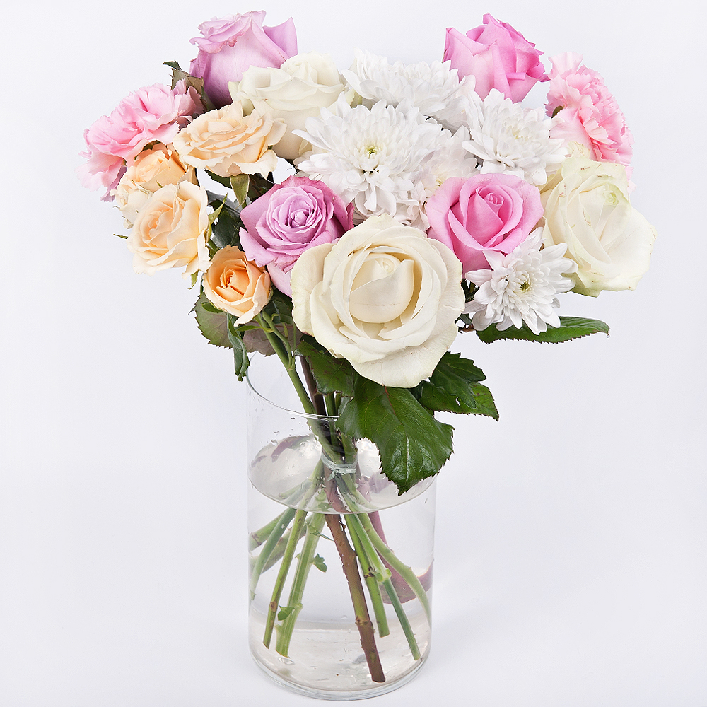 Celebrate life's moments with this elegant bouquet, featuring a harmonious blend of white roses, pink roses, chrysanthemum spray, carnations, and spray rose. Together, they create a melodious arran...