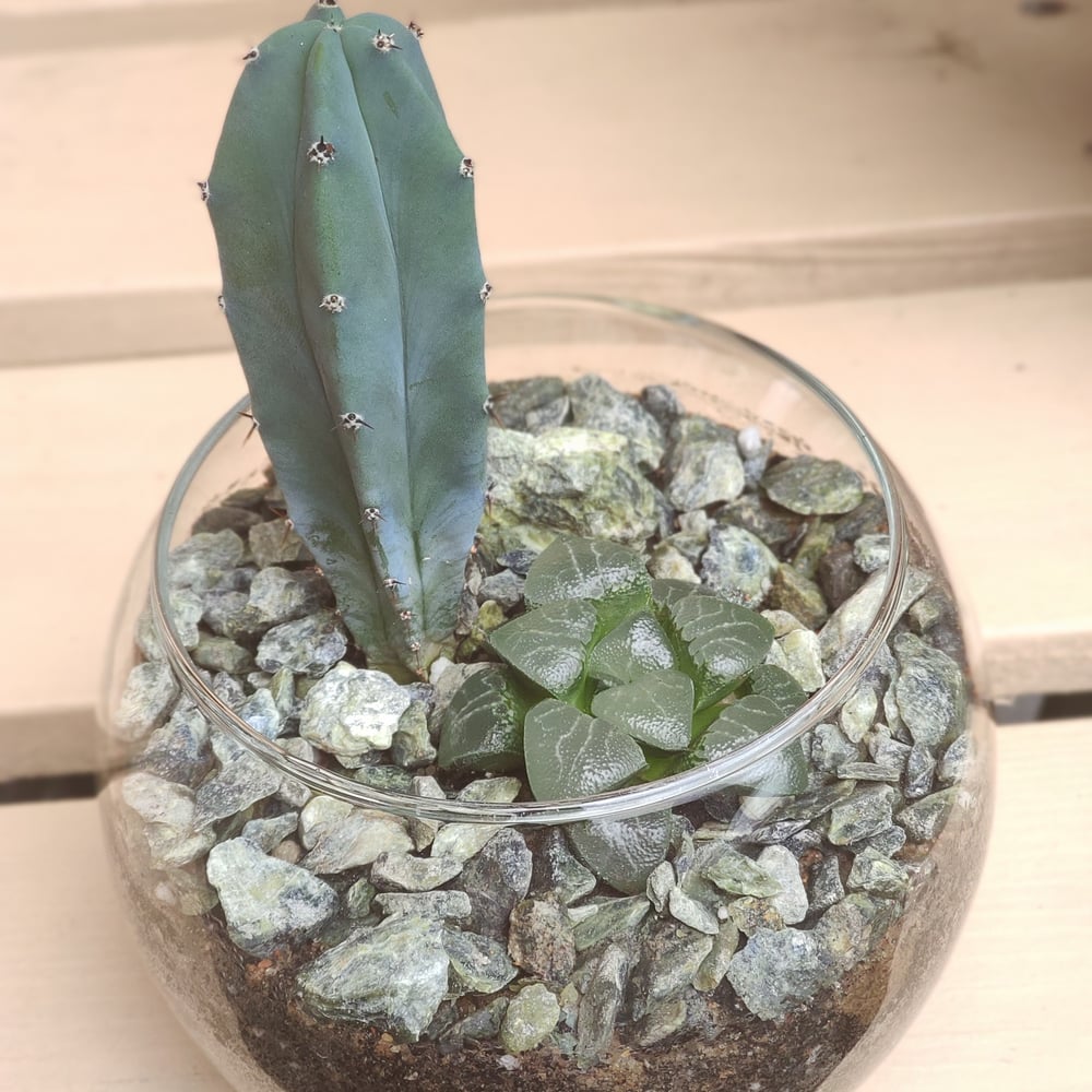 Этот набор суккулентов очень неприхотлив (кактус и хавортия), теневынослив, поливать можно из шприца или аккуратно из ложечки под каждое растение, направленно. Застой воды опасен, растения могут сгнить. Лучше недолить, чем перелить. Хоть растения и теневыносливы, тем не менее тёмный угол комнаты не подходит, как и место у компьютера в глубине комнаты. В этом случае требует дополнительной подсветки, например настольной лампой. Флорариум полностью готов. Камень, используемый для декора - змеевик. Не требует пересадки в ближайшие пару, тройку лет. Зависит от скорости роста растений. Если захотите подкормить, то только в весенне-летний период и удобрениями для кактусов. Чем меньше, тем лучше - такое правило очень годится для кактусов и суккулентов, так как они в природе растут в бедных почвах, и порой в экстремальных условиях.