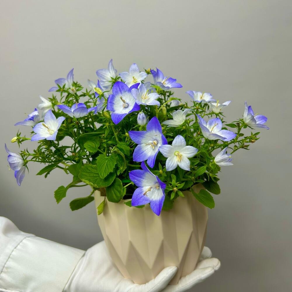 Кампанула (Campanula) - это ампельное травянистое растение с тонкими стелющимися или свисающими вниз побегами. Листья очередные, округло-сердцевидные с зубчатыми краями, на длинных хрупких черешках, от 3 до 5 см в диаметре.