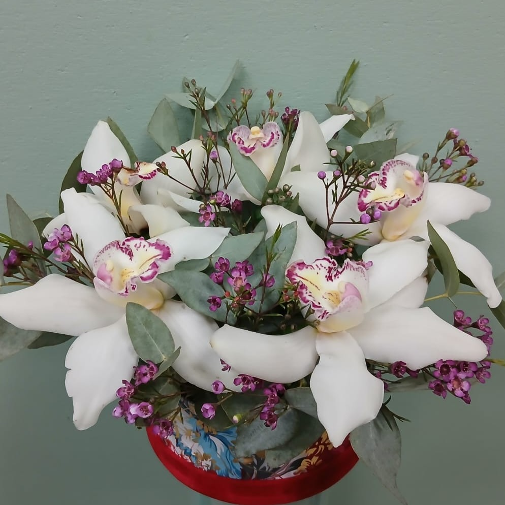 Шляпная коробка с цветами «Карусель» из орхидей