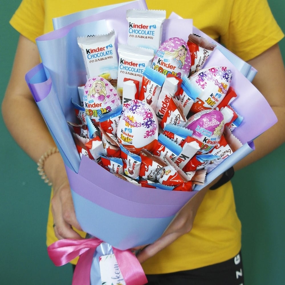 Состав букета: яйцо киндер, шоколадки киндер, конфеты