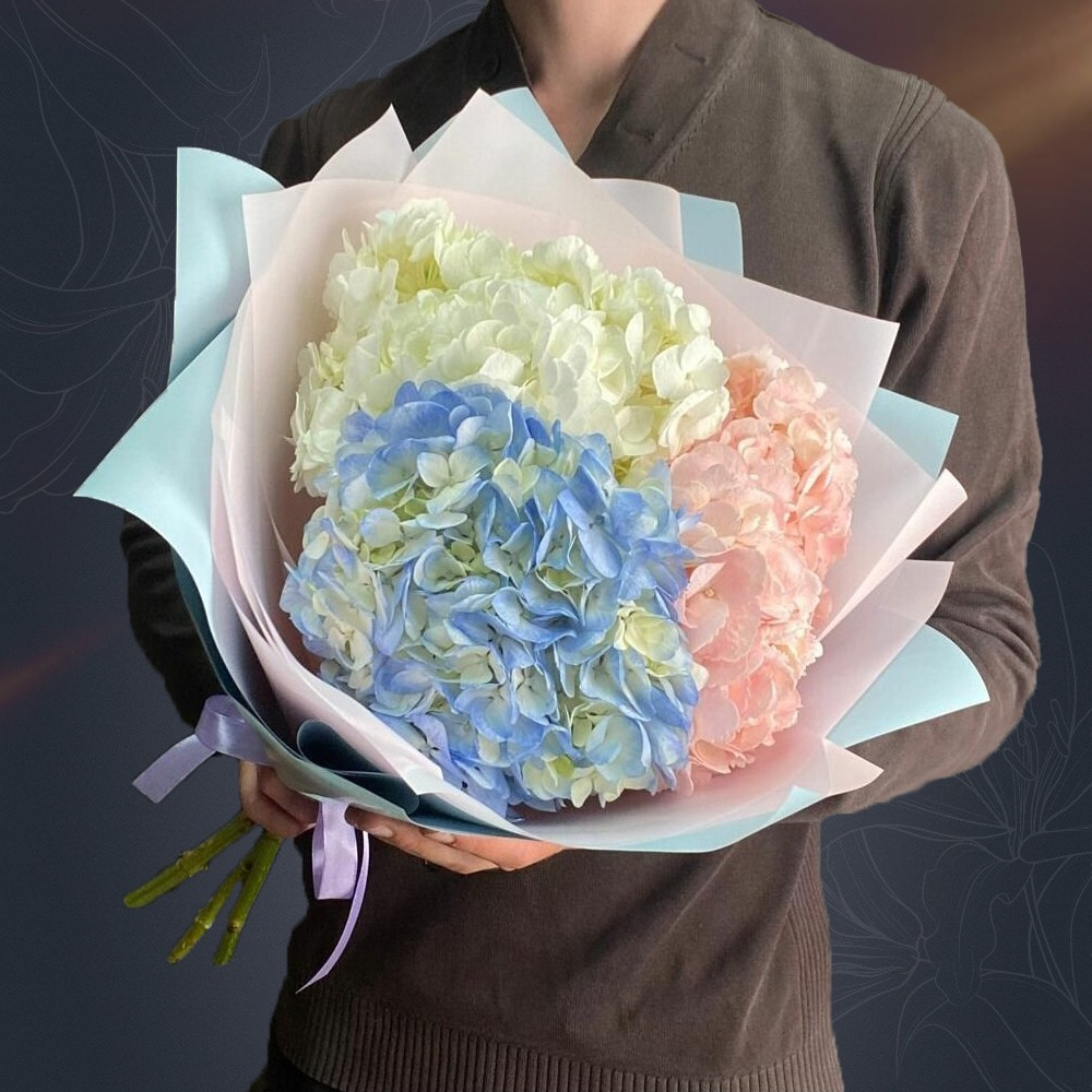 Букет из 3 гортензий микс - это классический монобукет, который станет отличным подарком для любого повода. Букет состоит из трех разноцветных гортензий, которые собраны на стеблях и обернуты в ко…