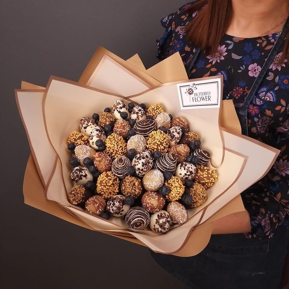Съедобный фруктовый букет из клубники в шоколаде в крафте