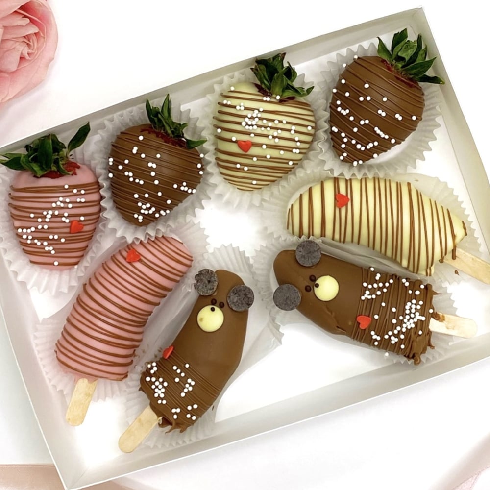 Клубнично-бананоаый набор в шоколаде премиум класса с дизайнерским оформлением.