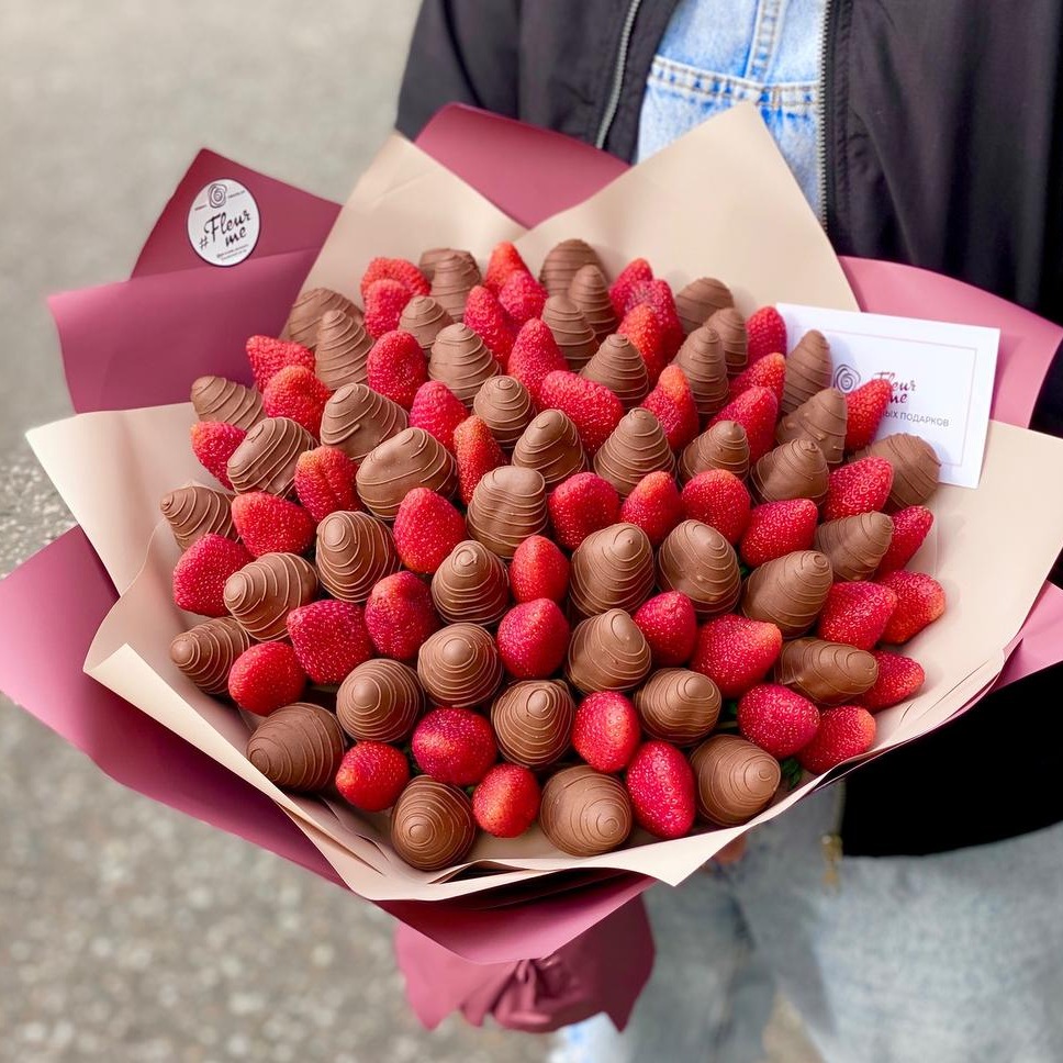 Состав: клубника свежая отборная - 1625 гр. шоколад бельгийский молочный - 1 шт. Ароматная большой букет из свежей клубники в молочном бельгийском шоколаде. Кол-во клубник в букете может изменяться в зависимости от калибра ягод. Каждый букет упаковывается в прозрачную защитную пленку, чтобы исключить контакт ягод с окружающей средой, дополняем карточкой с рекомендациями по хранению красивой открыткой с Вашим текстом по желанию. Срок хранения клубники в шоколаде - 2 суток. Мы рекомендуем насладиться ягодами в течение 12 часов с момента покупки и при необходимости хранить букет в холодильнике при температуре от +4 до +10 С Перед употреблением подержать при комнатной температуре 15 минут