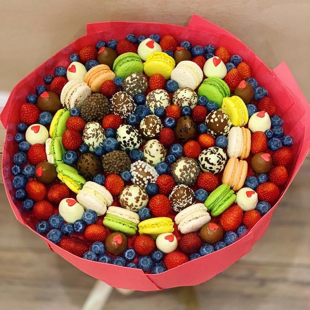 Состав: Упаковка - 3 шт. Голубика - 200 гр. Клубника в шоколаде - 600 гр. макарон (пирожное) - 17 шт. клубника свежая - 400 гр.