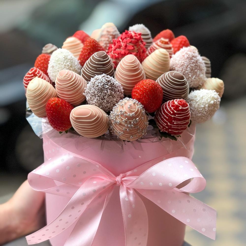 Сocтaв: Клубника в белом шоколаде - 8 шт. Клубника в молочном шоколаде - 8 шт. Клубника - 8 шт. клубника в розовом шоколаде (бельгия) - 8 шт. Цилиндр - 1 шт.
