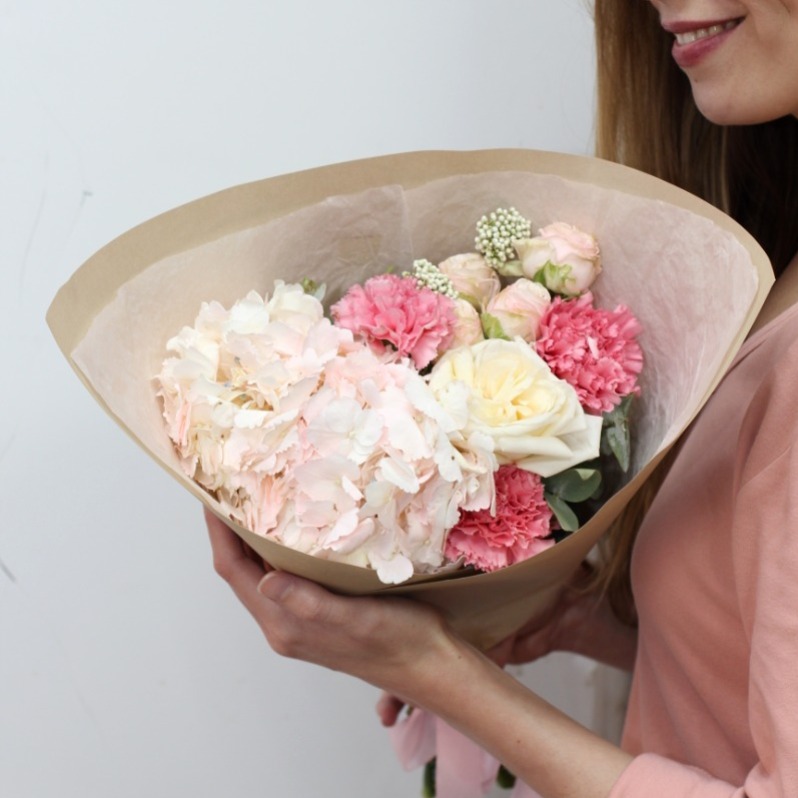 Букет «Клубничный коктейль» из гвоздик и роз