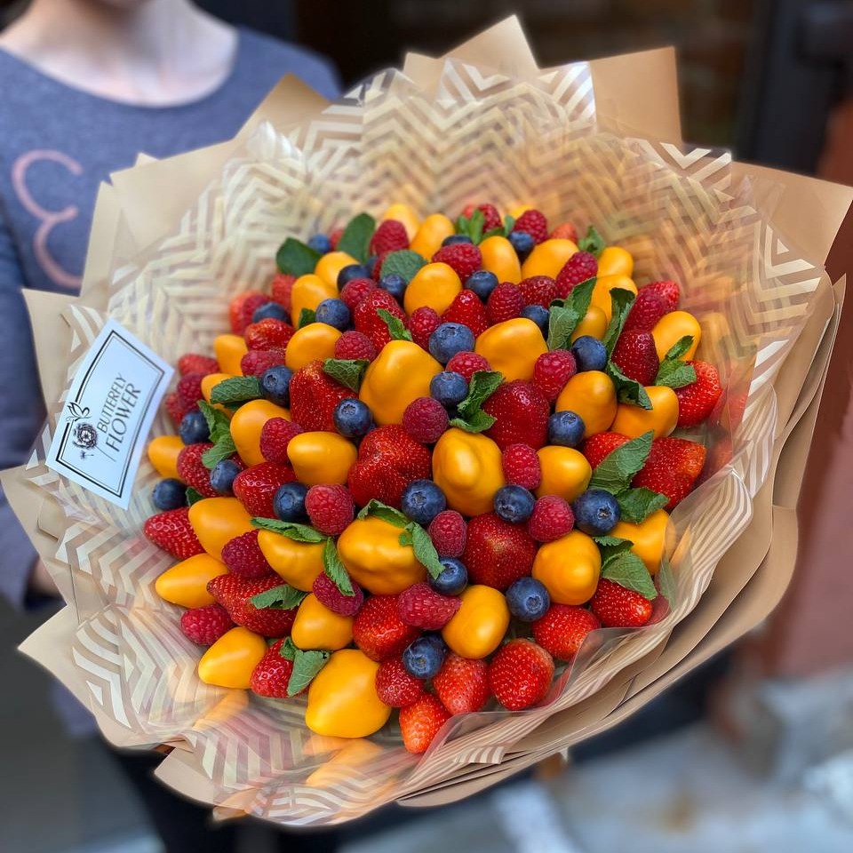 Съедобный фруктовый букет из клубники в шоколаде, мяты, голубики и малины