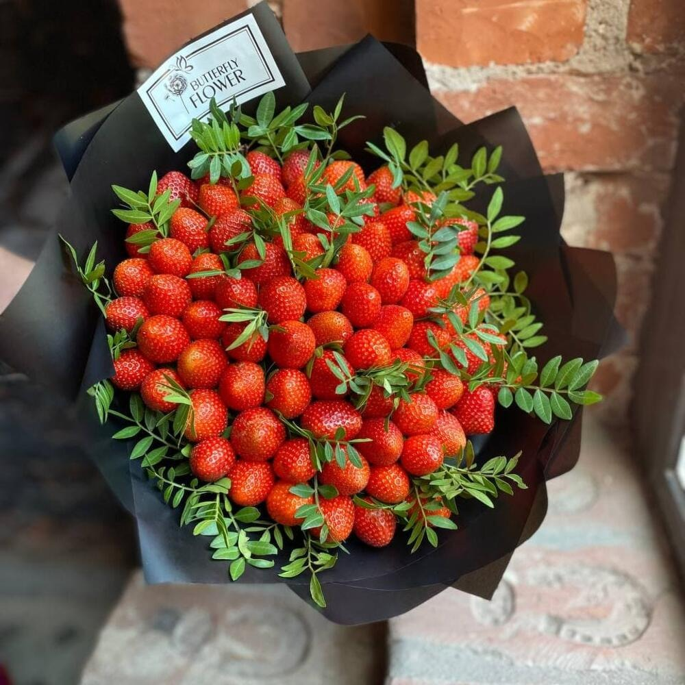 Съедобный фруктовый букет из клубники и фисташки в черном крафте